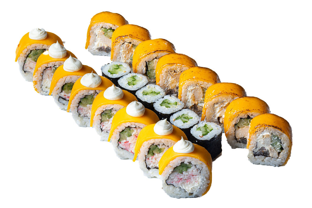 Sushi set 22pcs: Cheese maki 8pcs; Cheese maki with chicken 8pcs; Cucumber hosomaki 6tk.